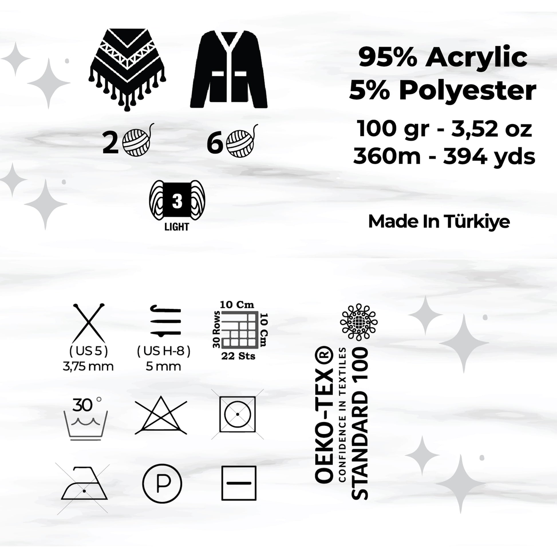 CERTIFIED, DURABLE, AND ECO-FRIENDLY: The yarn is CERTIFIEDas STANDARD 100 by OEKO-TEX to be FREE from Harmful Chemicals and ArtificialSynthetics.